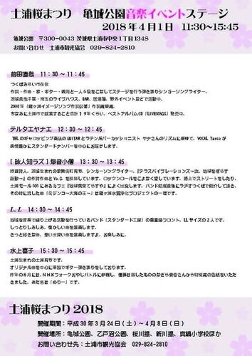 こちら茨城県南部も桜の花が一気に咲き始めましたー、春ですな~。この週末が満開かな?そんなグッドタイミングで土浦の桜まつりで歌います!たぶん野外でしょう。多くのダンスチームの合間に演奏が入るステージ・・・どんな感じかな、今年の桜を楽しみまし…